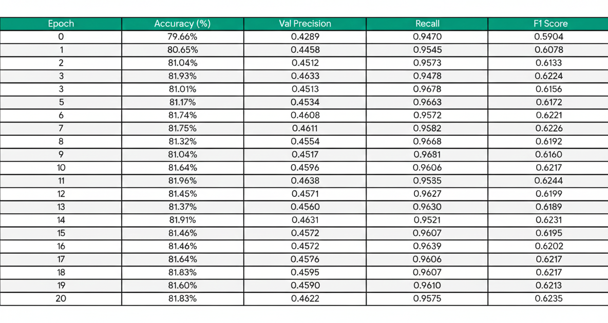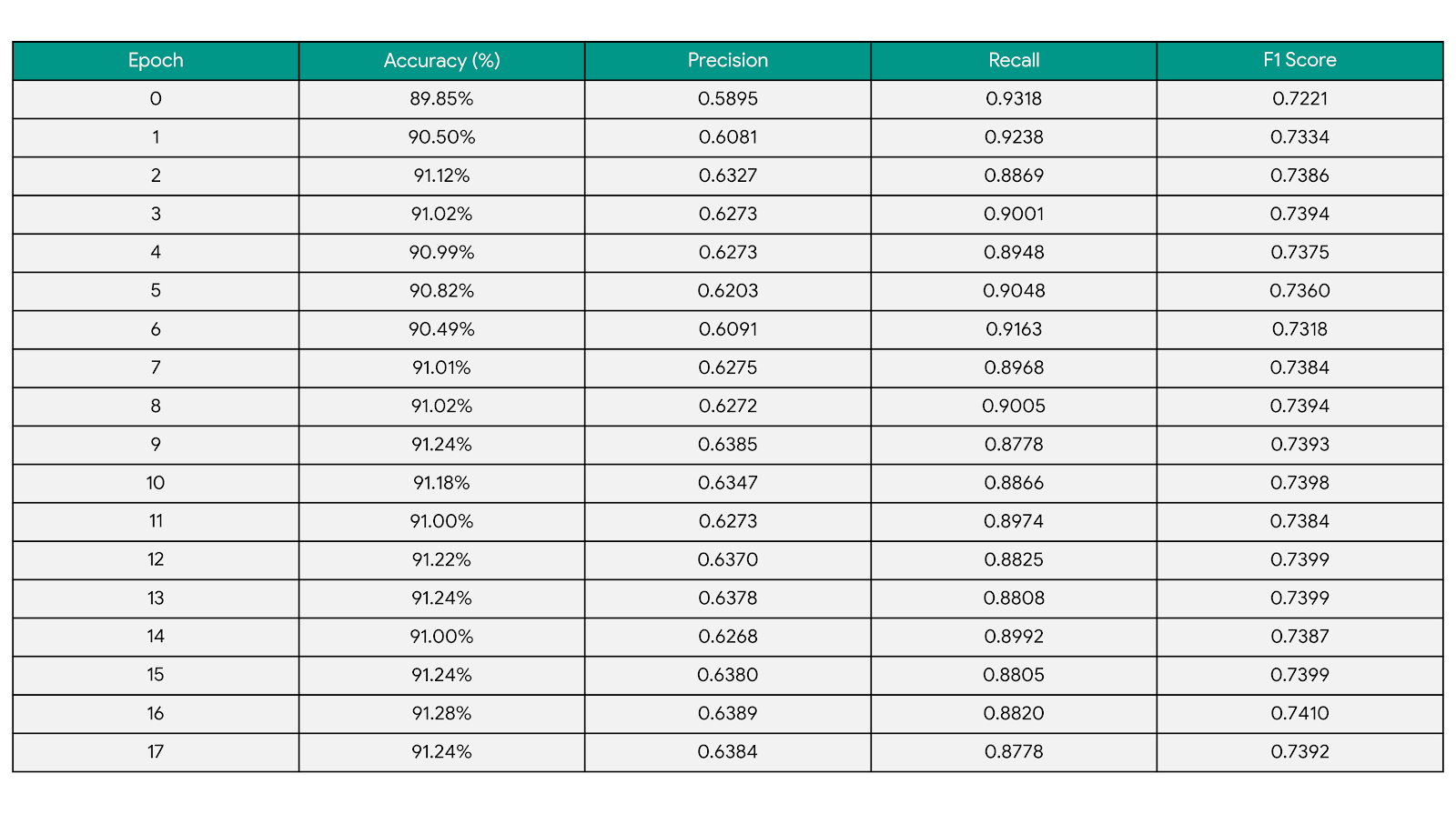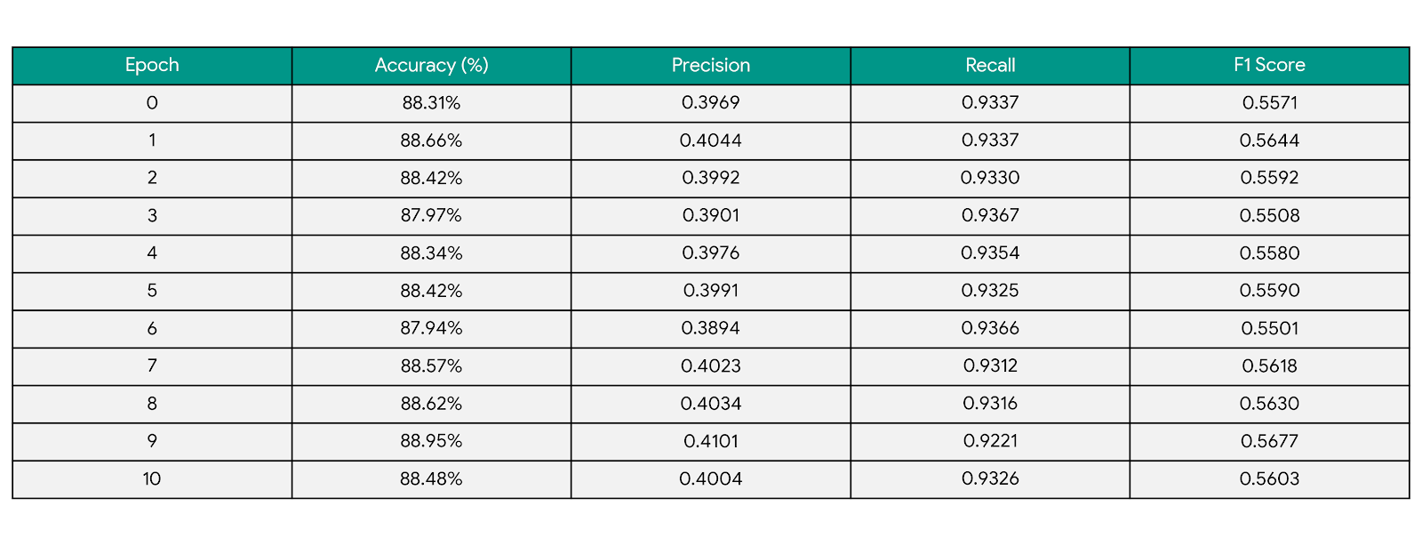 Validation statistics per epoch graph