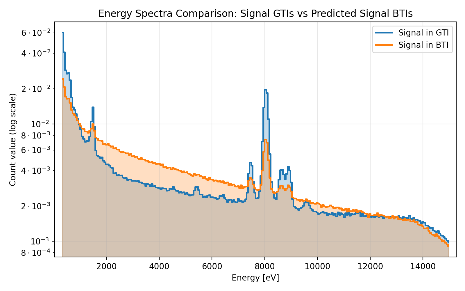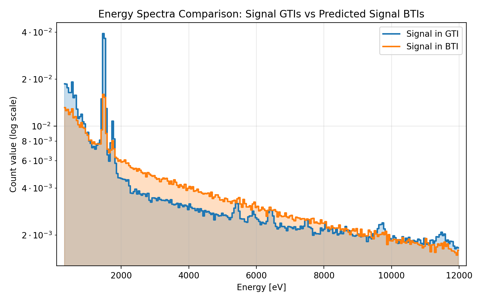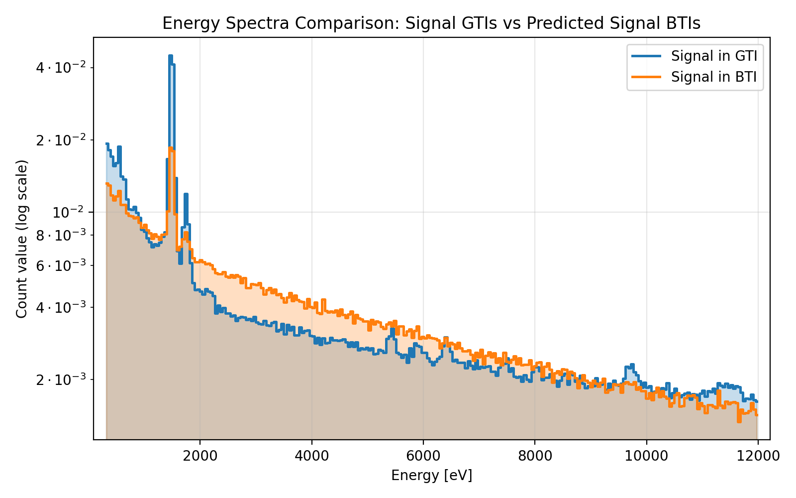 Inference signal comparison for MOS2 Log-scale energy spectra comparison between Signal GTIs and Predicted Signal BTIs.